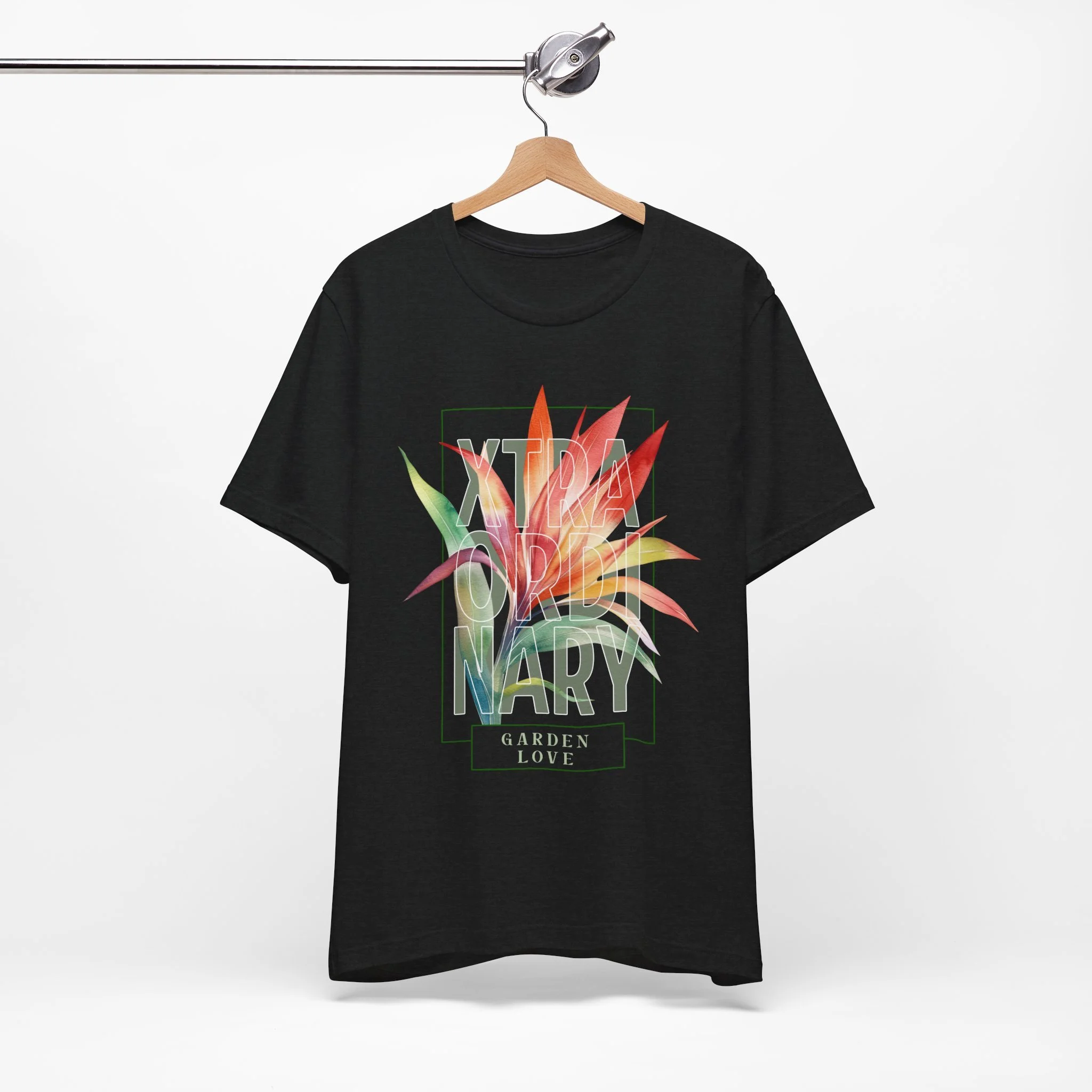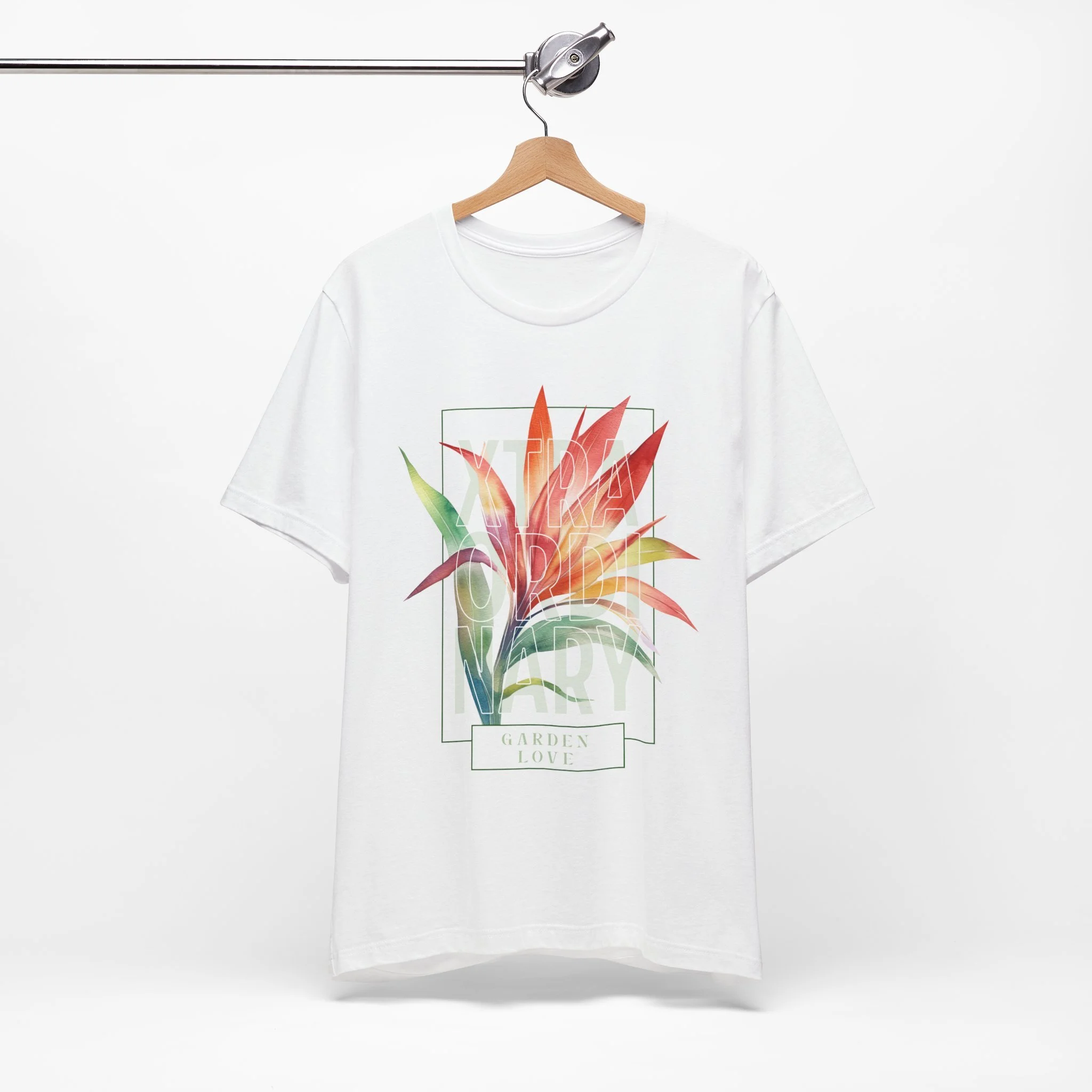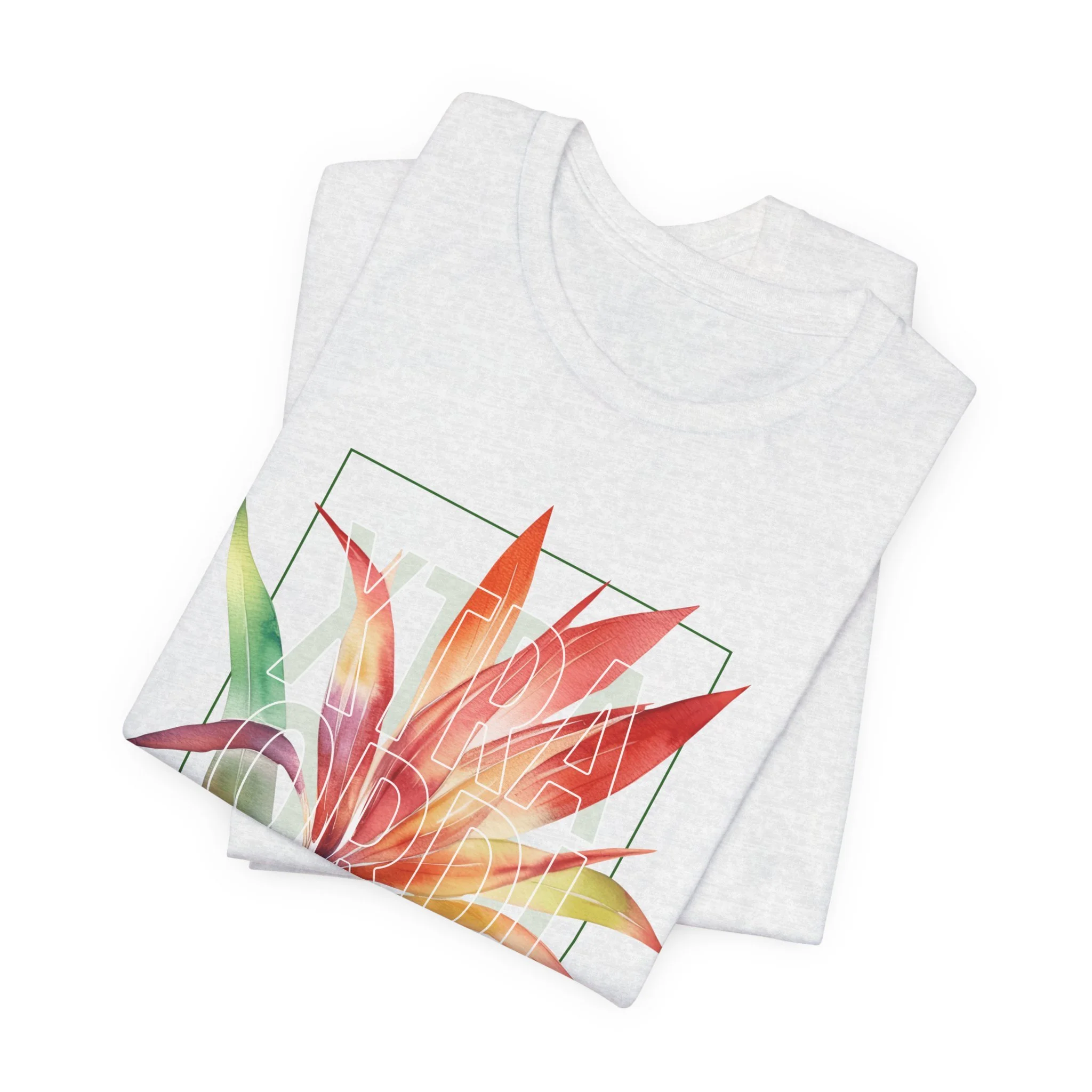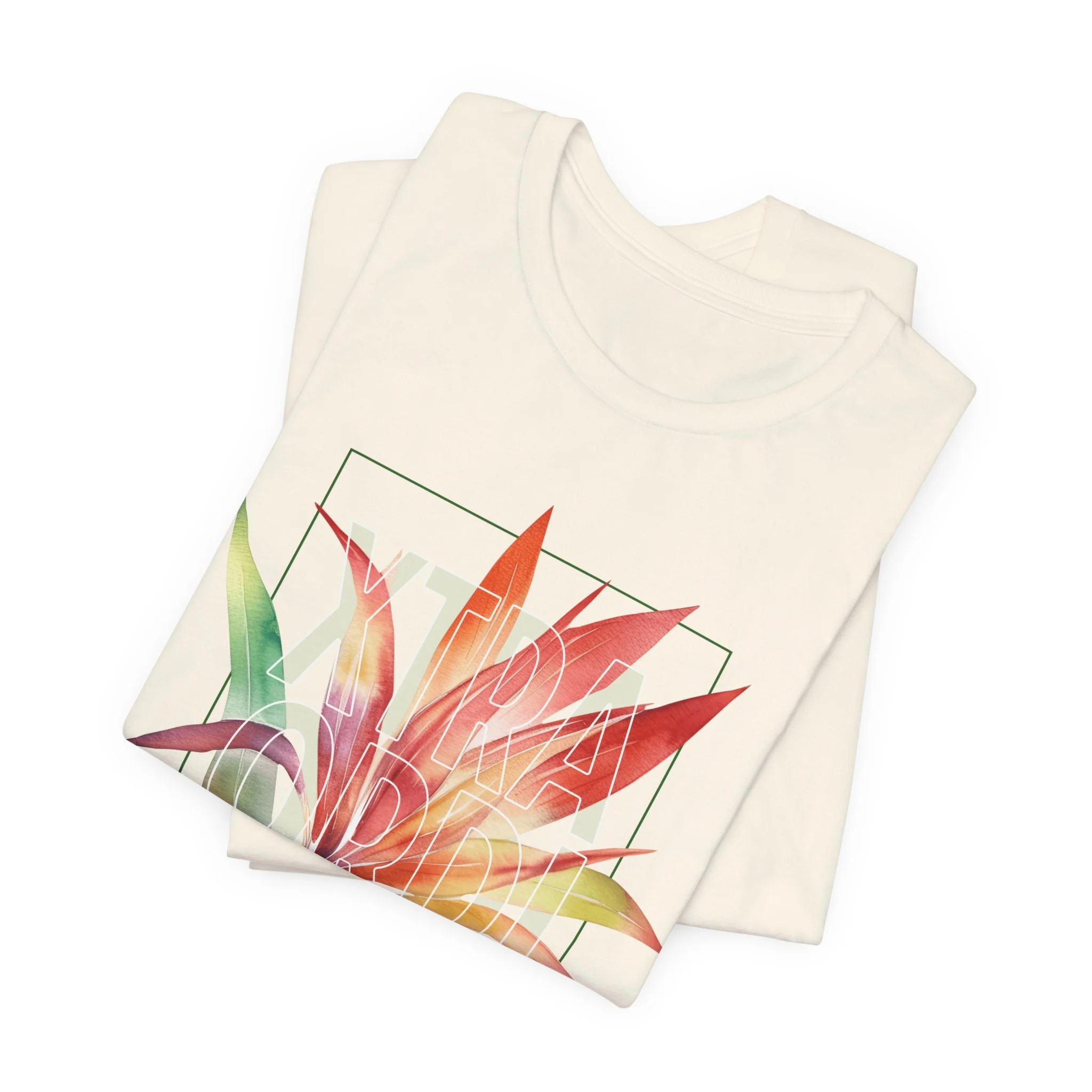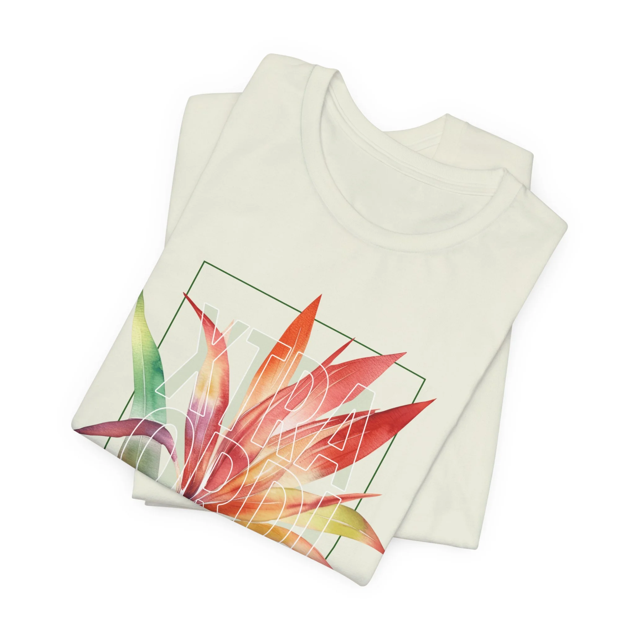 Soft, breathable tee with a watercolor botanical print that feels like a warm breeze from a coastal garden. The painted tropical bloom sits inside a faint rectangular frame, its warm reds, oranges and greens fading like sunlight through petals. Wear it layered under a lightweight jacket or alone on a sunlit walk — it settles into everyday life while keeping a gentle, artful statement. The crew neck and retail fit keep the silhouette neat; fabric is lightweight and airy for all-day comfort. Ethically produced and REACH certified, this shirt pairs quiet design with responsible manufacturing.