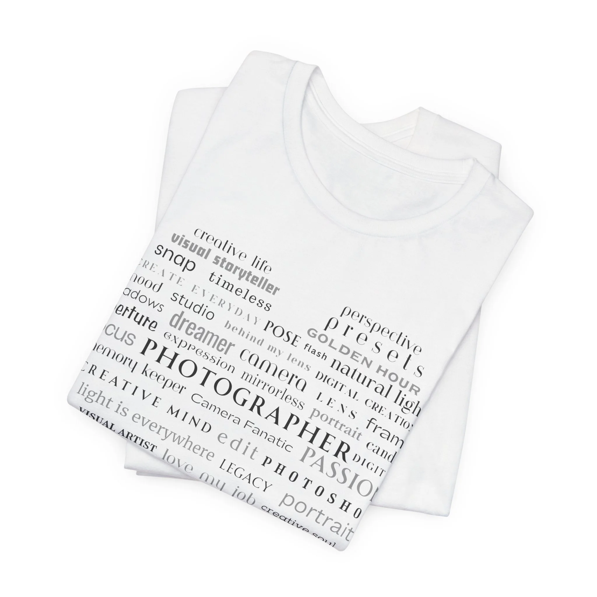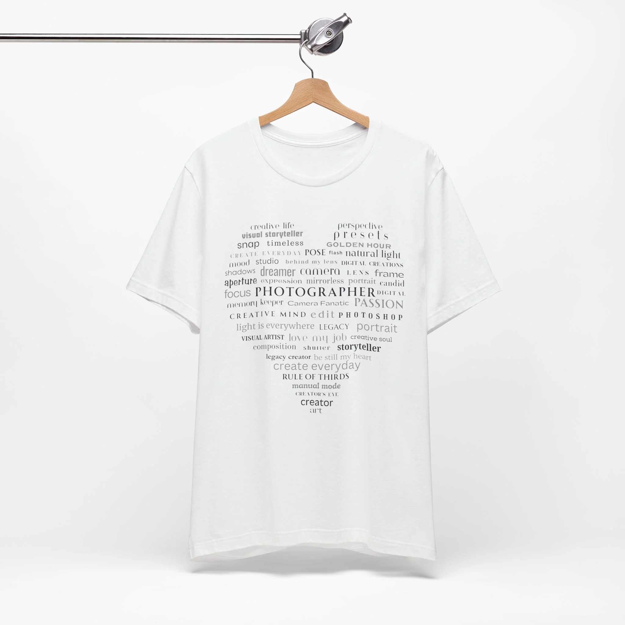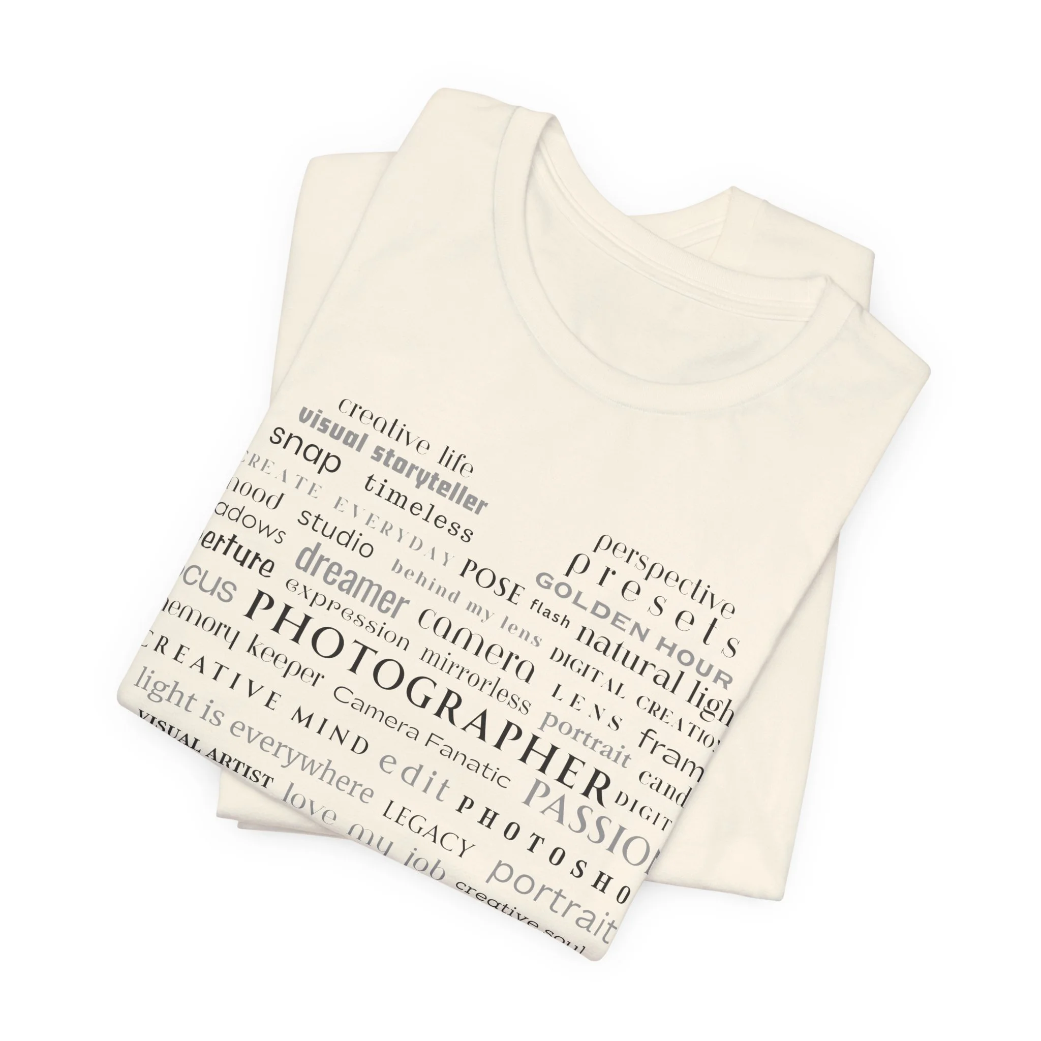 Featuring words like photographer, storyteller, creative mind, and legacy, this minimalist tee reflects the art behind the lens without overexplaining it.