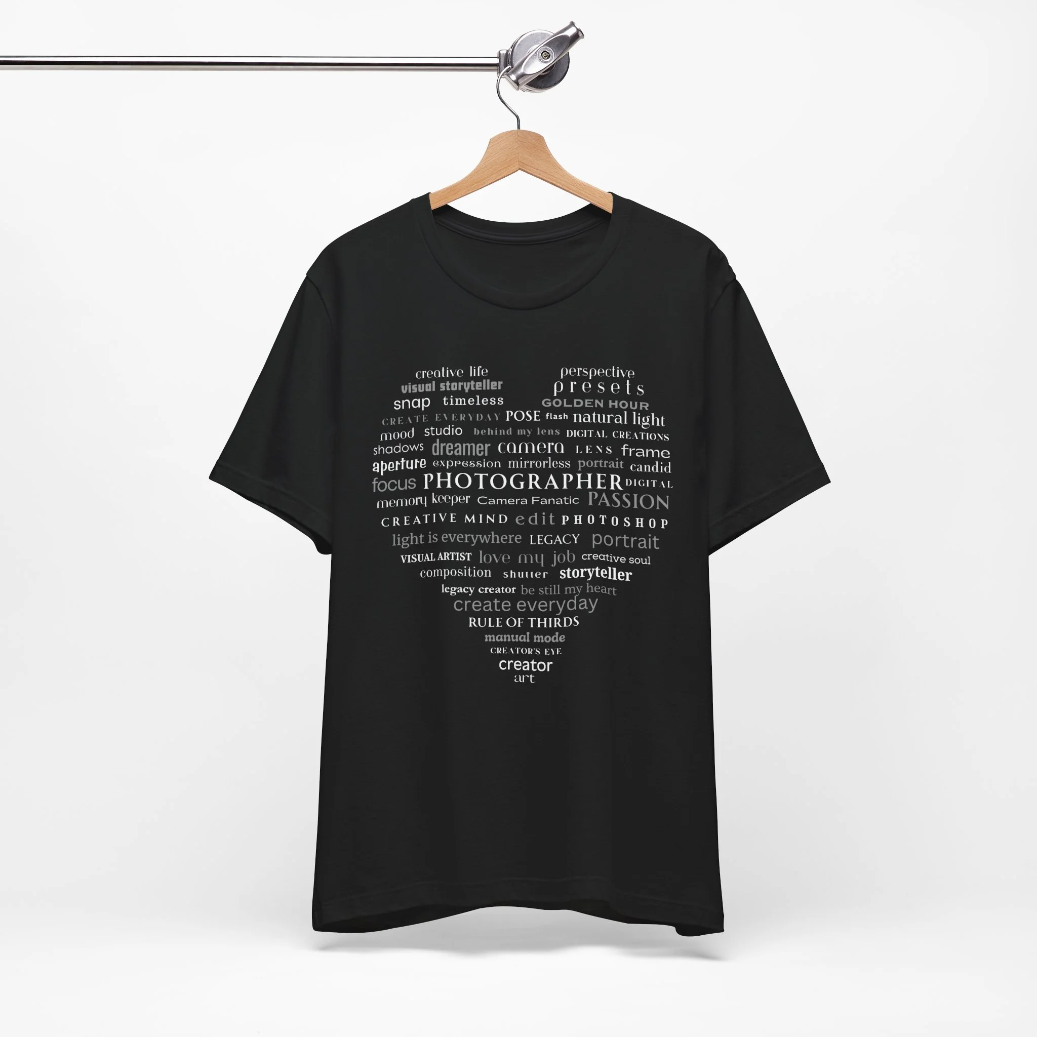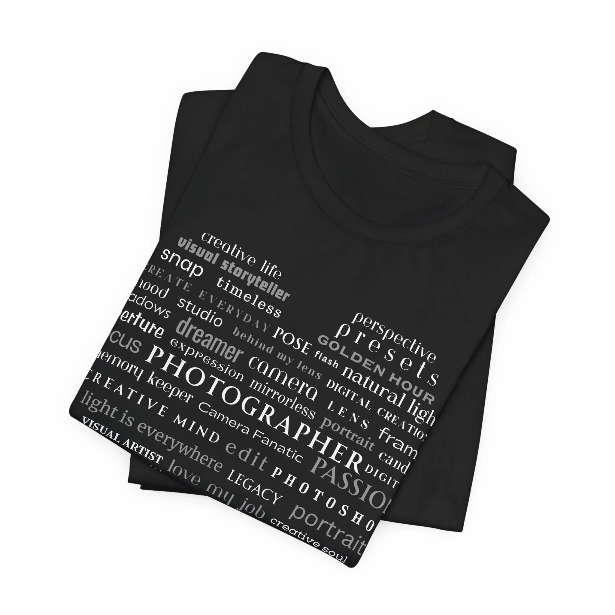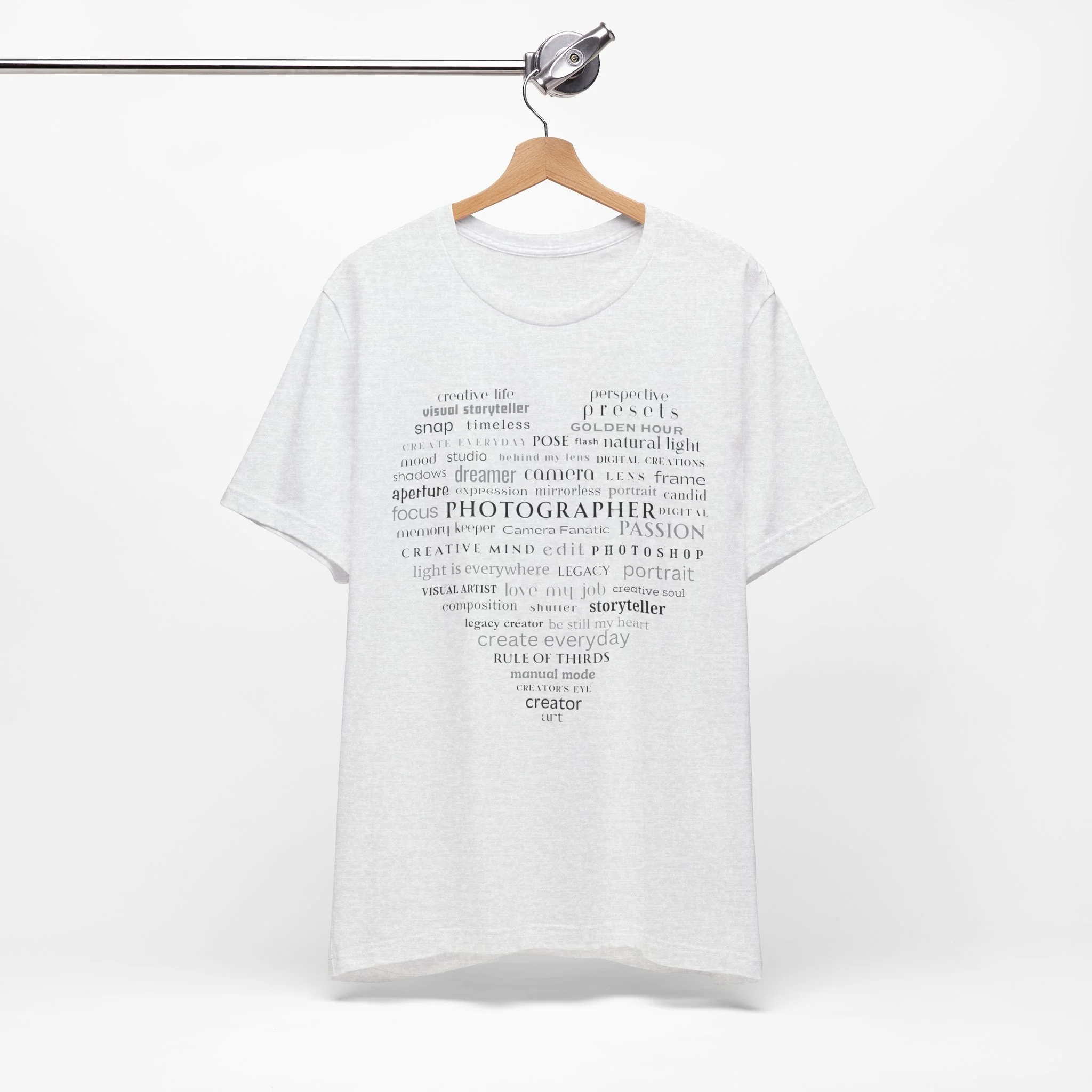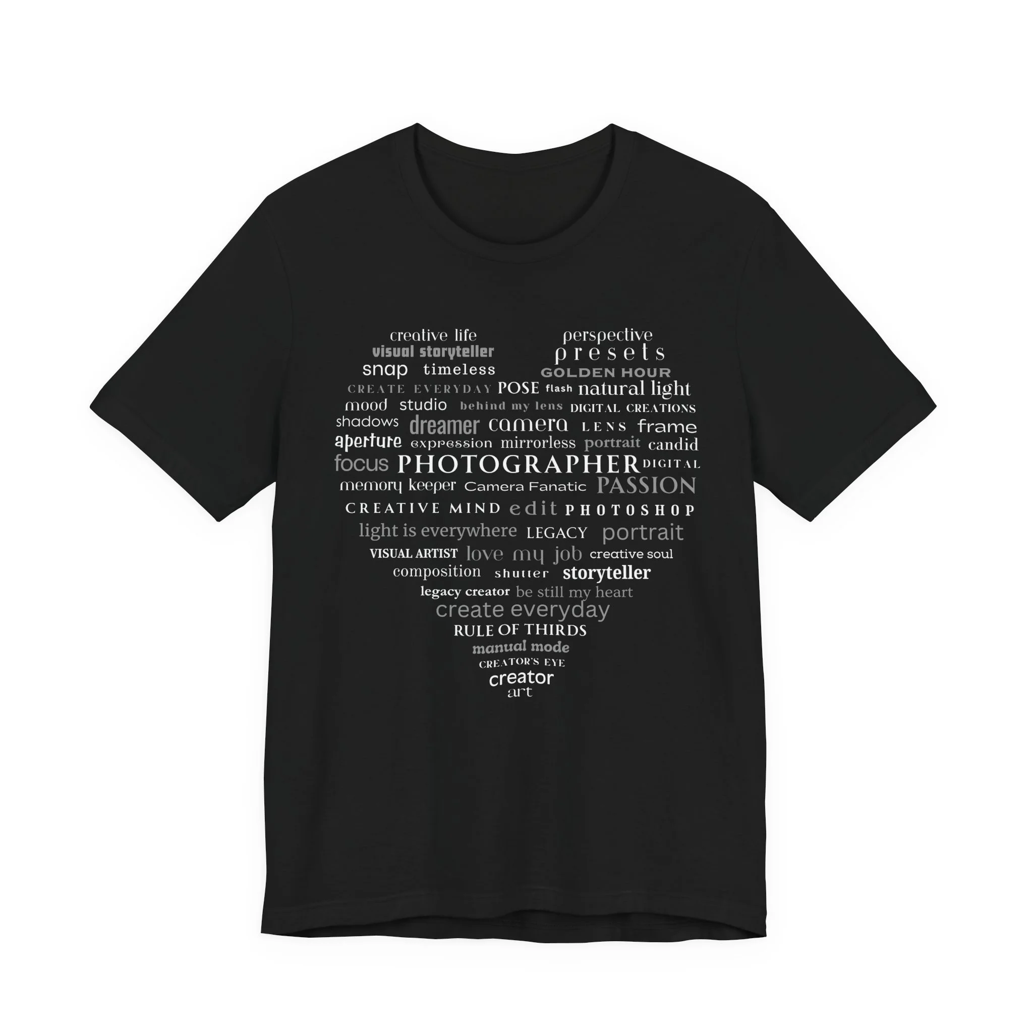 Featuring words like photographer, storyteller, creative mind, and legacy, this minimalist tee reflects the art behind the lens without overexplaining it.